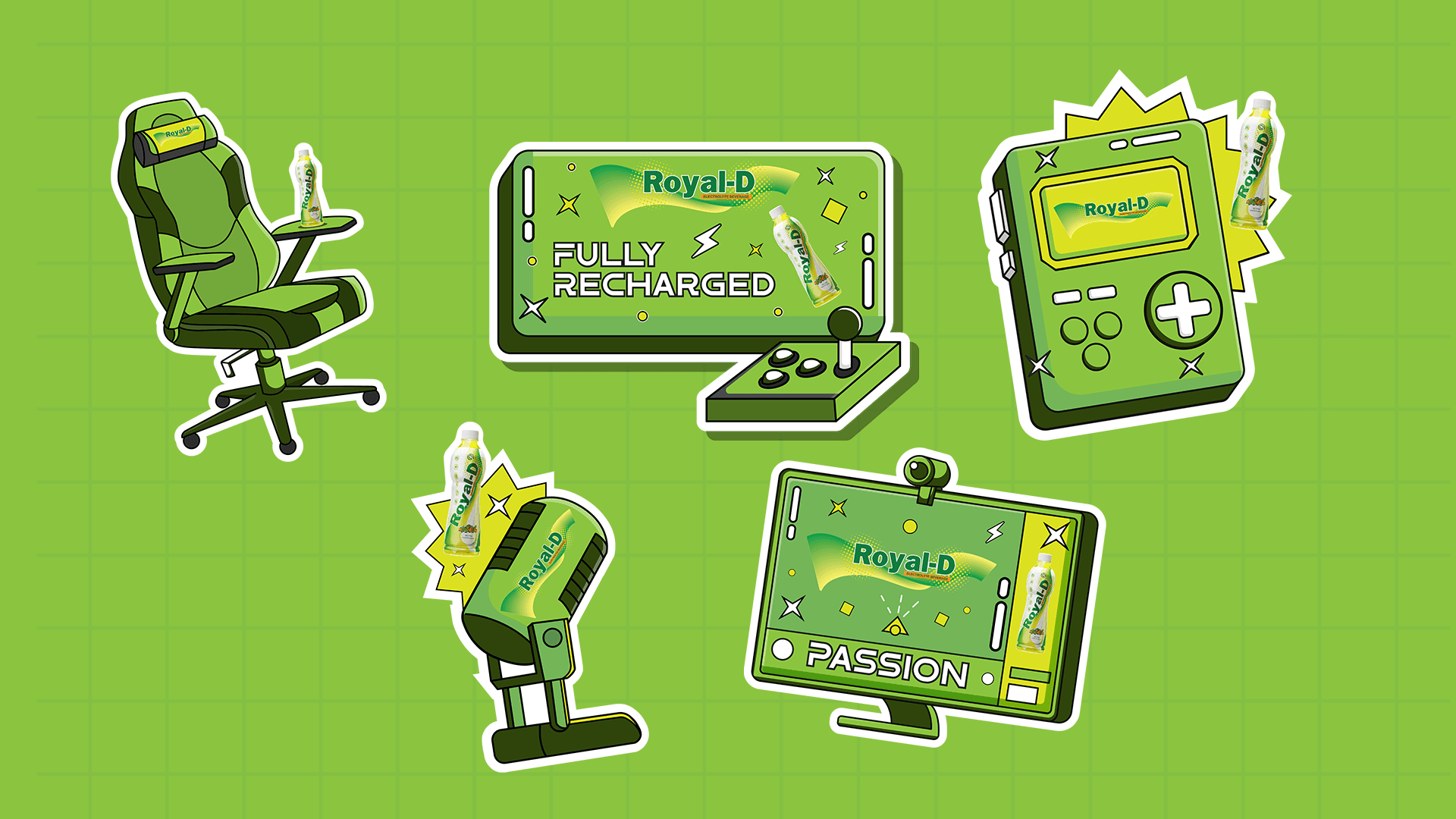 This project features a series of creative gaming stickers designed for Royal-D Energy Drink. The designs were developed in alignment with the brand’s visual guidelines, with a focus on highlighting the Royal-D identity in a fun and engaging way.These stickers were distributed as gifts during a Royal-D Gaming Event, where they became a crowd favorite—well-received and loved by participants for their vibrant and energetic designs.